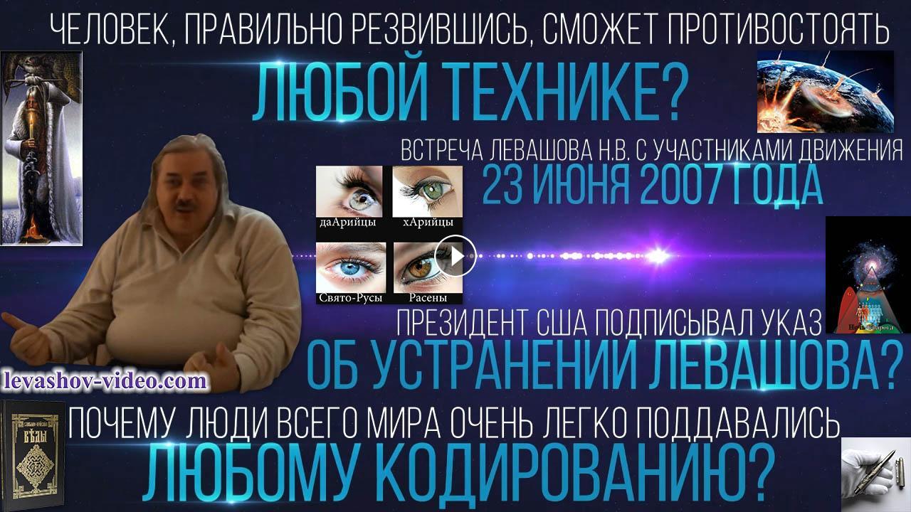 Отрывок из встречи Левашова Николая Викторовича с участниками Движения 23.06.2007. № 2: 0:25:17 - 0:38:23. В ролике обработан звук и улучшена картинка с помощью нейросети, добавлена заставка, добавлены иллюстрации.