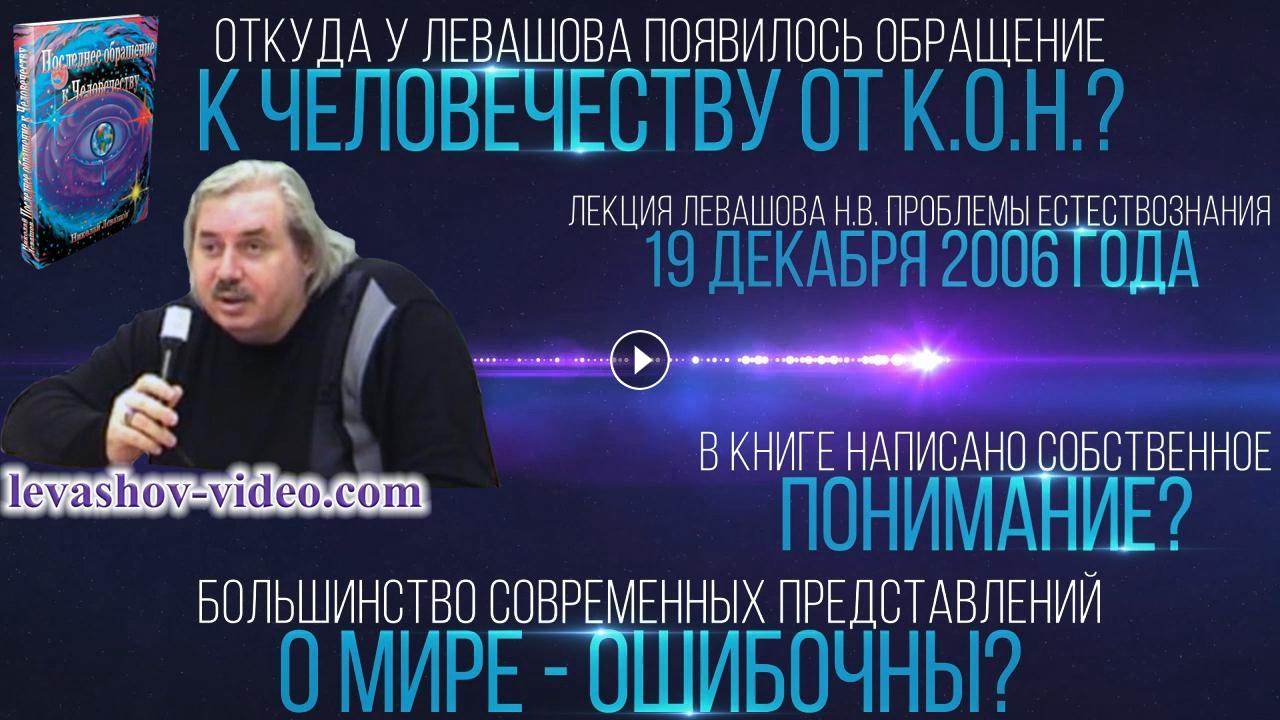 - Откуда, у Левашова, появилось, обращение к человечеству, книга «Последнее обращение к человечеству», К.О.Н., КОН, Коалиционный Отряд Наблюдателей, передал человек, беседовали, 1988 год, поместил, большинство представлений, ошибочны, в мире, протереть глаза, проснуться, неправильно, излагать, представления возникли, собственное осмысление, изучение природы, создал инструмент, окончил школу, университет, кафедра, теоретическая радиофизика, естественные науки, искать, попытался, 19.12.2006