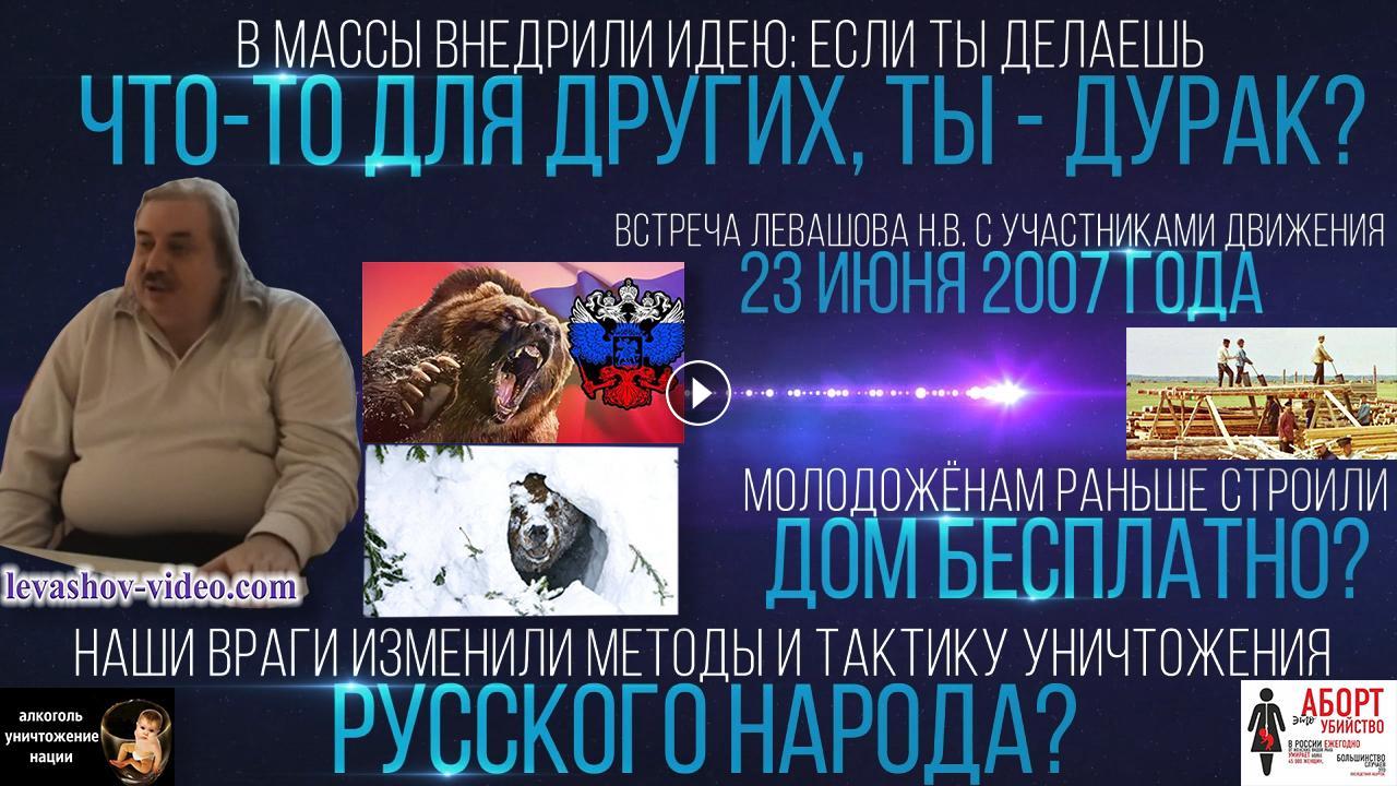 Отрывок из встречи Левашова Николая Викторовича с участниками Движения 23.06.2007. № 5: 0:52:45 - 0:57:50. В ролике обработан звук и улучшена картинка с помощью нейросети, добавлена заставка, добавлены иллюстрации.