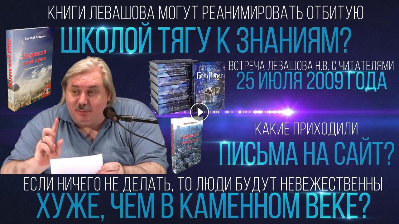 Отрывок из встречи Левашова Николая Викторовича с читателями 25.07.2009. № 2: 0:10:49 - 0:17:58. В ролике обработан звук, добавлена заставка, добавлены иллюстрации.